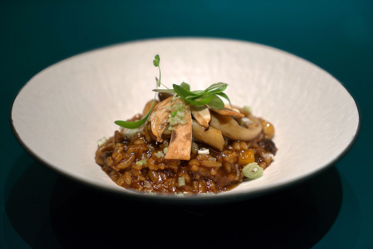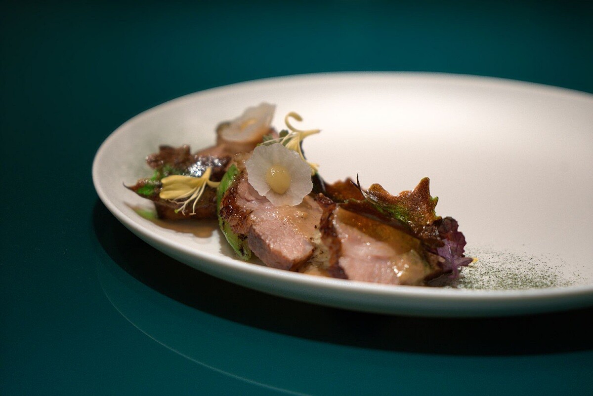 主廚林昊語的外婆總愛親手製作米食和醃漬醬菜,這份記憶也成為這道菜的靈感。將伊比利豬梅花先用腐乳醬醃漬入味,再低溫舒肥,最後以炭火封住肉汁與脂香,再刷上花雕酒和鮮奶油調製的醬汁,炭烤的煙燻香、豬肉的濃厚豐腴成為最迷人的搭配,一旁還有炭烤絲瓜、醃漬蘿蔔,以及用野薑花和薑汁鳳梨製成的脆片,能自由搭配著享用富有食趣,最後撒上羽衣甘藍粉,還要搭配一杯特製薑汁鳳梨酒一起享用,無處都是細節,也充分展現中西融合的趣味。