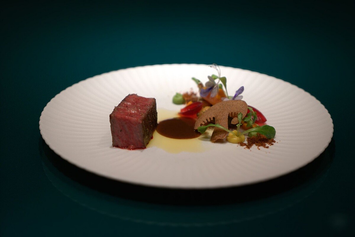 此道另有升級版本,選用日本F1奧羽牛紐約客,直火燒烤至外酥內嫩,肉質鮮嫩多汁。並重現台式牛排的三色豆,以玉米、甜豆和蘿蔔製成三色麵疙瘩,拌上黑胡椒醬汁,配菜包括香菇和洋菇混合烘烤的蘑菇脆片、甜菜根醃漬的珍珠洋蔥,靈魂醬汁則用牛肉湯汁加入豆豉調味,帶來發酵的鹹香與甘甜,最後以自製蘿蔔油與脆粒增添溫潤根菜香氣。