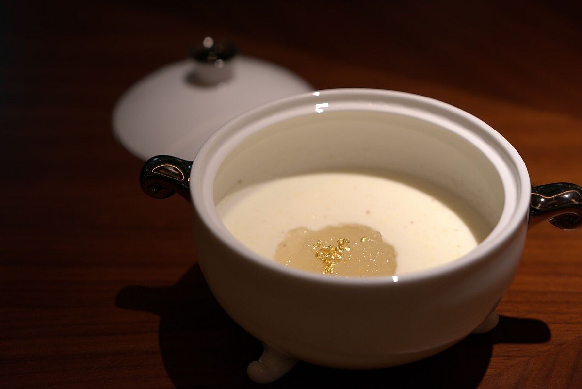 「冬至」是一年中白天最短的日子,也是進補最理直氣壯的時節。選用新鮮南非鮑魚為主角,搭配鵝掌、鵝翅、雞腳和赤肉等富含膠質的食材慢火熬煮。經過靜置、清蒸、再靜置等繁複工序,讓食材充分吸收各種風味和膠質,呈現出柔嫩又有彈性的完美口感。搭配上特製、醇厚的鮑汁,此外,一旁還有「戈渣」,是使用鮑魚滷汁製成濃縮醬凍,裹進春捲皮後油炸製成,讓菜品更加完整且富有細節。