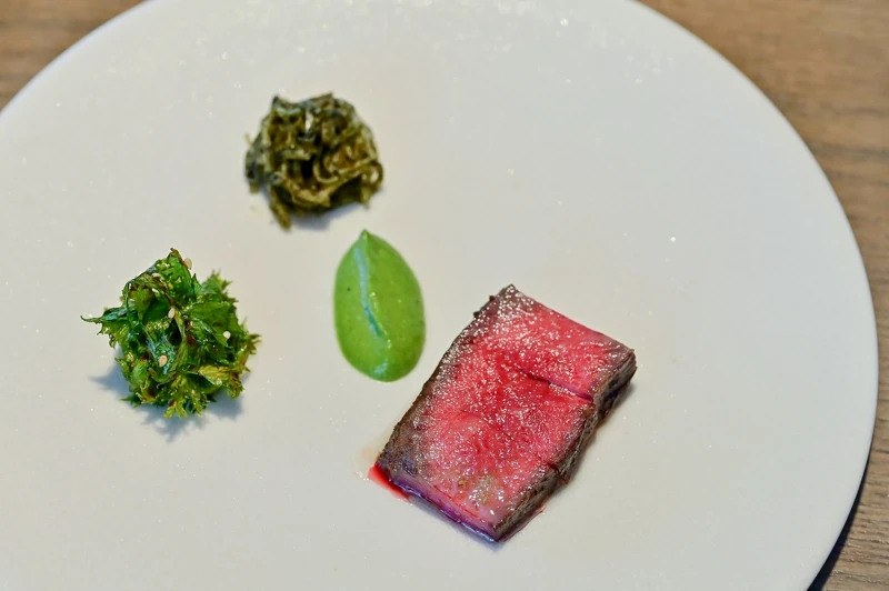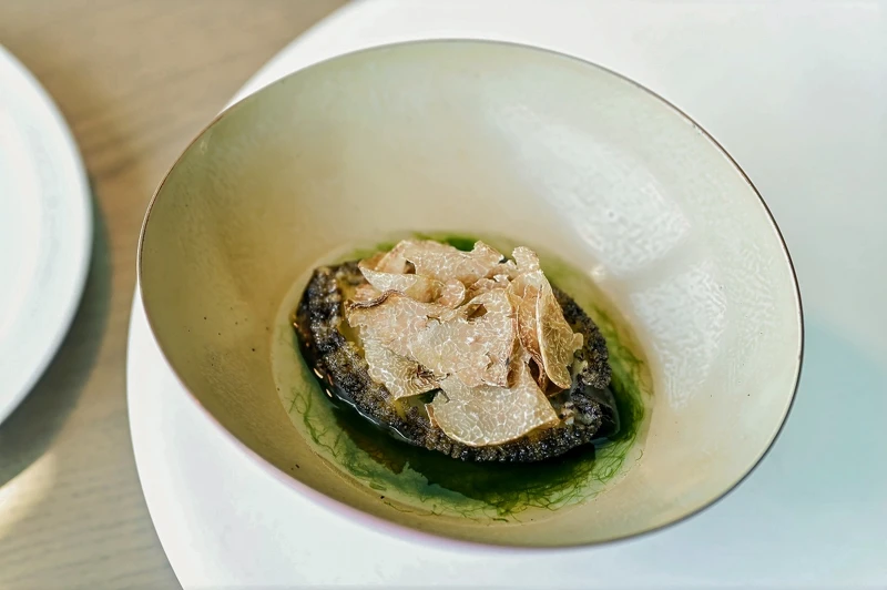 鮑魚在韓國菜中有崇高的地位,所以不少高級餐廳都會有鮑魚。「MOSU」的演繹是利用莞島郡的鮑魚,加入兩種不同的海帶,包括 Maesaengi 紫菜,它的質感柔軟纖細,像菜絲一樣,味道鮮美,一樣在韓國也被視為上等食材,配以柔軟的鮑魚,芳香的白松露,風味完美契合,將韓國食材的美好發揮得淋漓盡致。