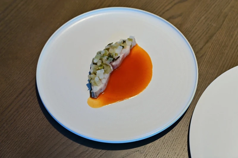 肥美的鰤魚,與白泡菜交替雙疊,加上山魷魚條,塑造成花形,加上9滴芝麻葉油(這個數字在韓國有「吉祥」之意)真的有魚在荷塘裏的花綻放,造型充滿詩意,美極了。事實上這是 Jimmy 在「J L studio」的檳城酸菜魚的變奏版本,酸香的湯汁,連結了海洋與土地的鮮味。