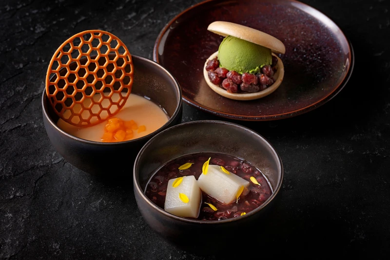 三款甜點選擇,尤其推薦 「麻糬桂花紅豆湯」,選用台灣高雄9號紅豆,搭配紫米與桂圓的香氣,綿密又溫潤,為整場饗宴劃下溫暖句點。