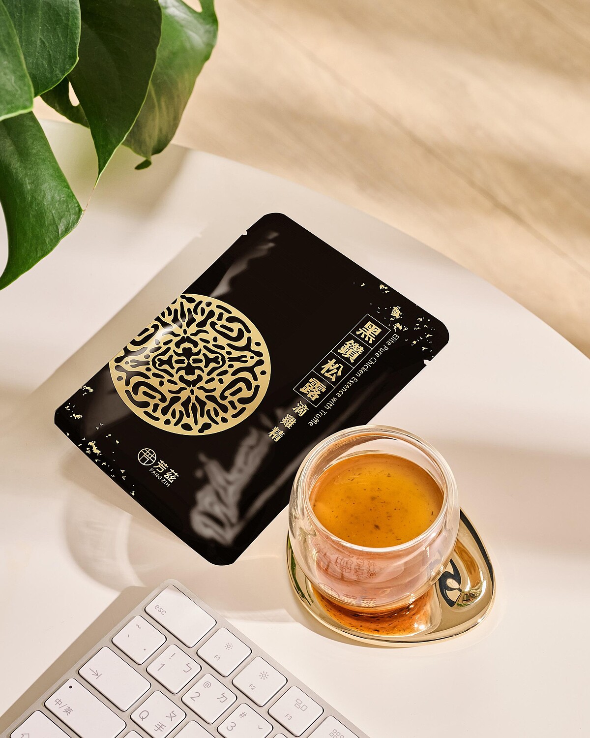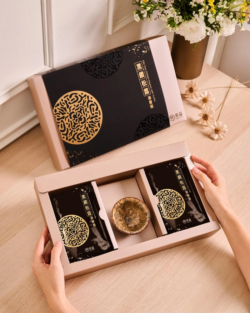 為了讓年節送禮更添氣派質感,芳茲「黑松露滴雞精」禮盒採用經典黑金配色設計,彰顯令人印象深刻的奢華時尚風格!禮盒內除了有常溫保存超方便的「黑松露滴雞精」還附贈精美的「天目釉品茗杯」,讓大家更優雅享用溫和滋補、補給元氣的美味滴雞精,健康迎接2025!