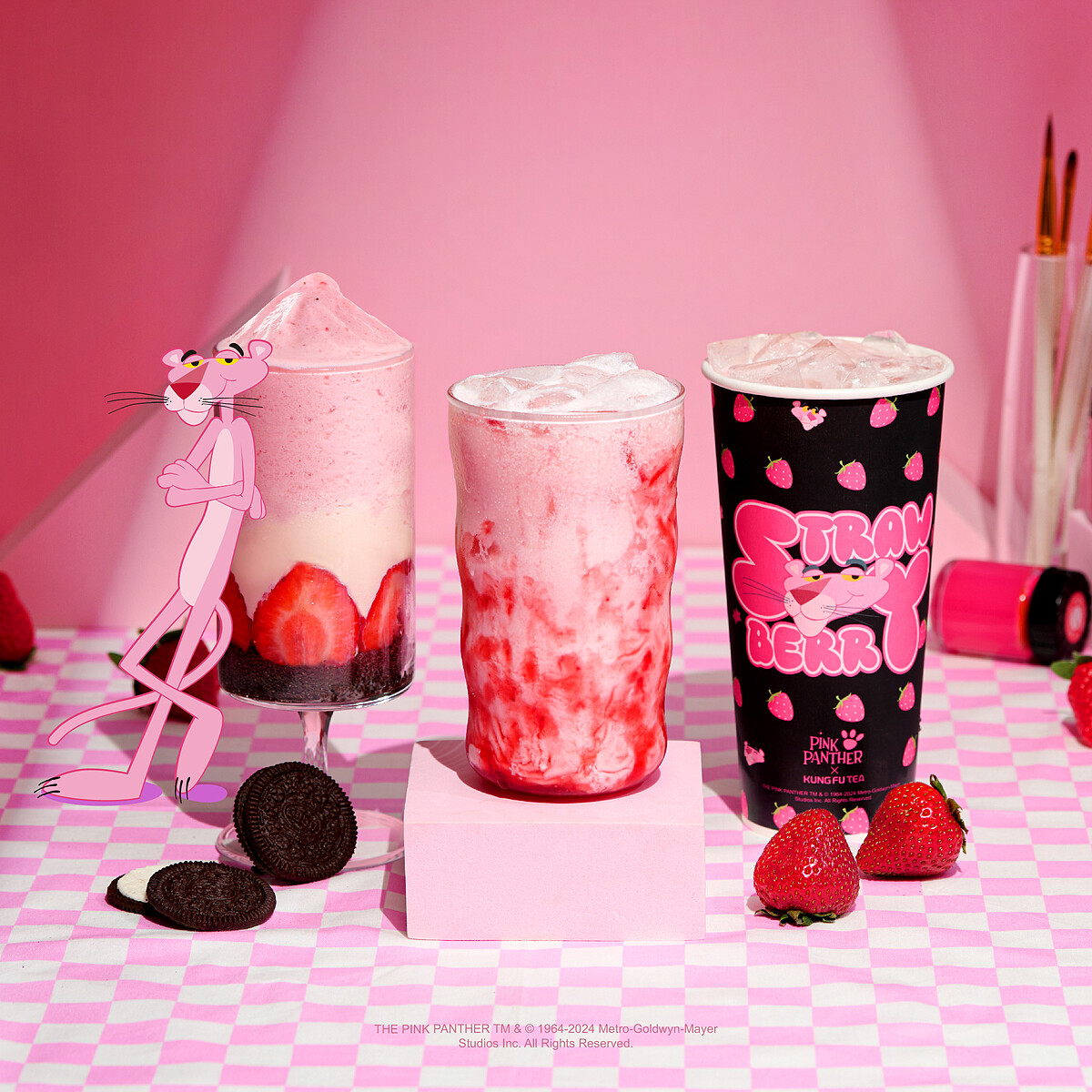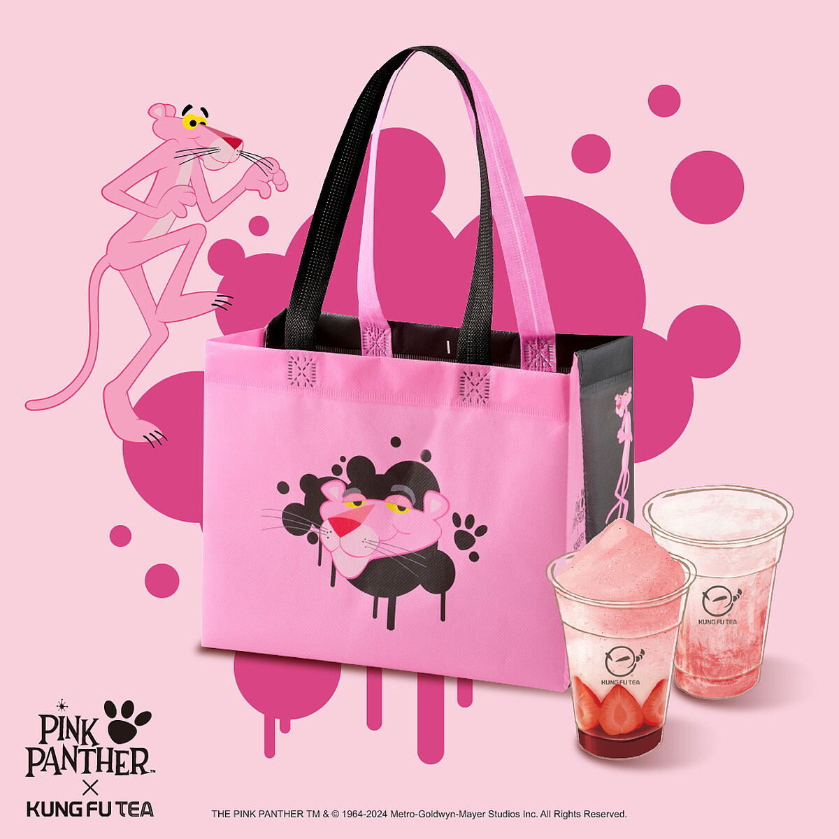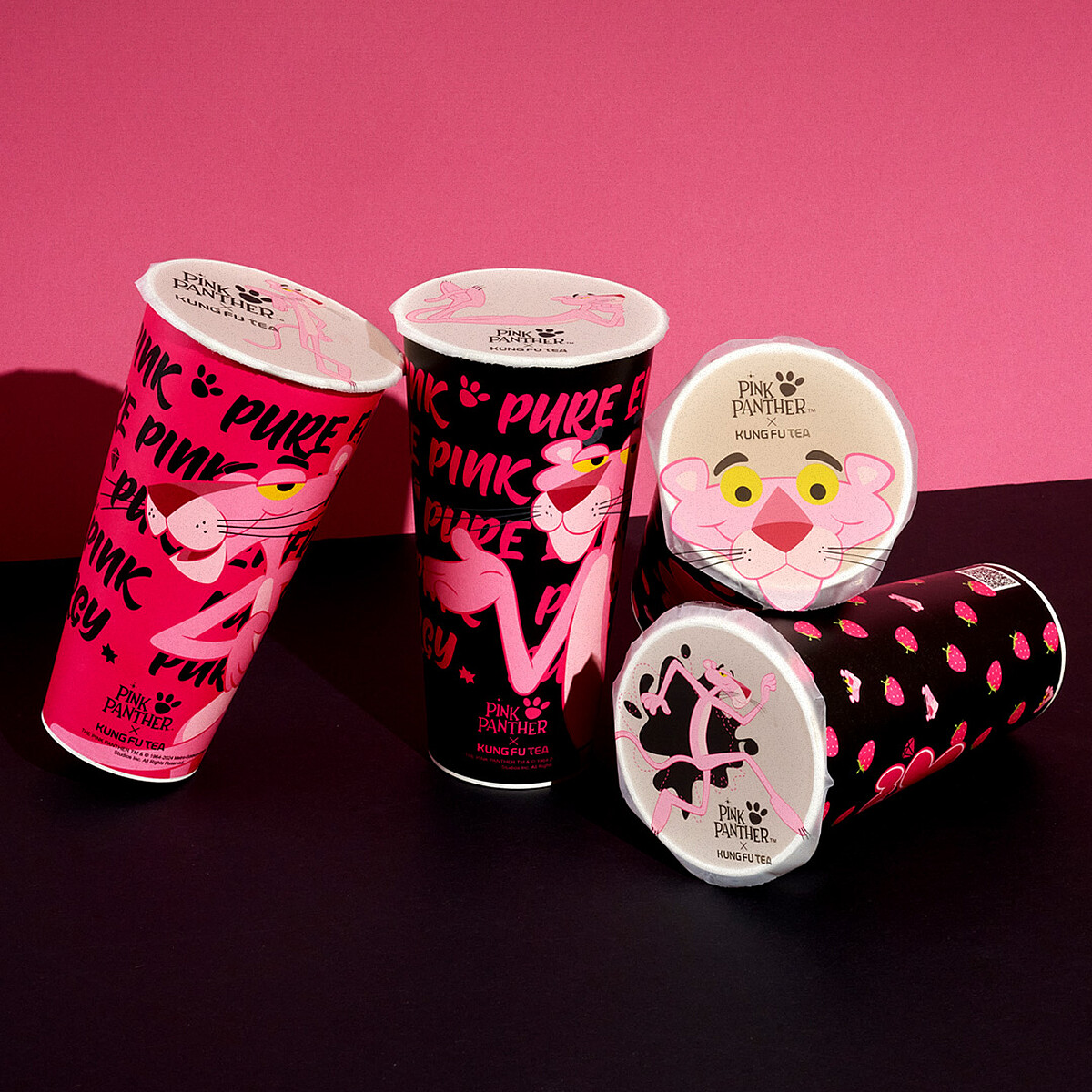 頑皮豹不僅是卡通史上第一個完全不說話的角色,還憑藉標誌性的粉紅色外型、魅力滿分的表現風靡全球。今年冬季功夫茶以頑皮豹的粉色魅力為靈感,將草莓元素融入聯名設計,推出期間限定飲品「草莓慕斯」和「草莓雪莎」,每一口都是滿滿的夢幻粉紅,甜到心坎裡!