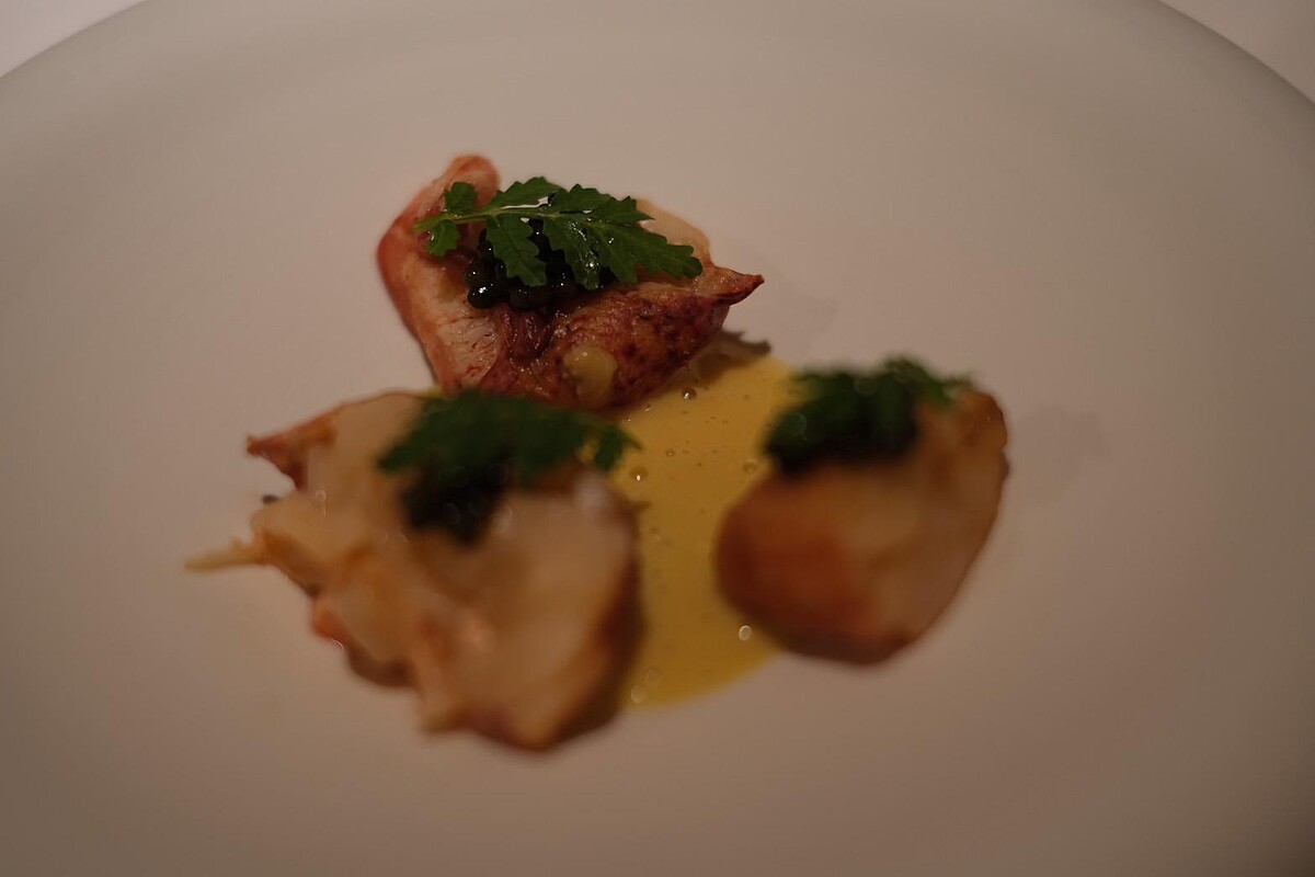 野生法國藍龍蝦被譽為「海洋中的藍色寶石」,以其鮮甜厚實的口感征服饕客味蕾。這道料理的靈魂來自主廚經典的奶油白醬,雪莉酒、香醋與奶油在不斷攪拌中達到極致細膩的口感,再融合龍蝦頭與蝦膏熬煮的濃郁醬汁,形成層次豐富的味道。低溫烹調後的藍龍蝦刷上龍蝦醬汁燻烤,搭配魚子醬與百香果香氣的萬壽菊葉,彷彿置身於海底深處,感受大自然的擁抱。