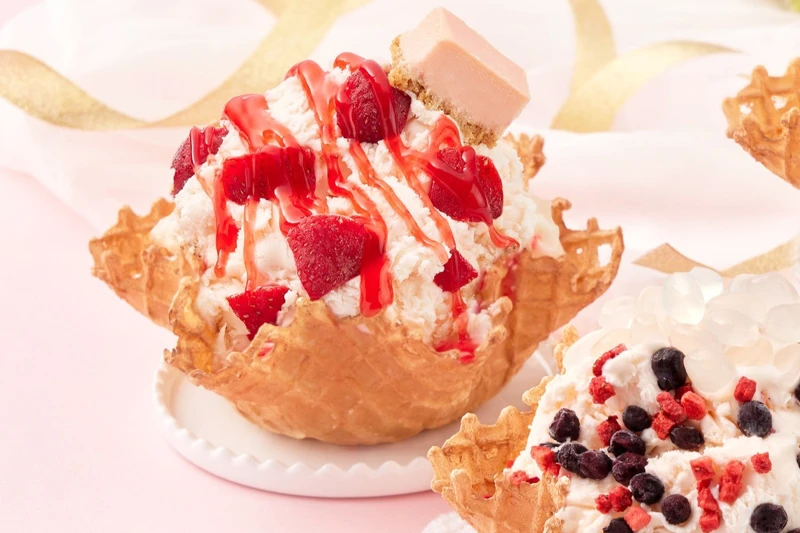 將草莓優格冰淇淋加入藍莓與草莓碎粒,撒上晶瑩剔透的QQ晶珠,打造Q彈脆口的雙重莓果體驗,咀嚼間多重層次瞬間爆發,口感絕對滿分。