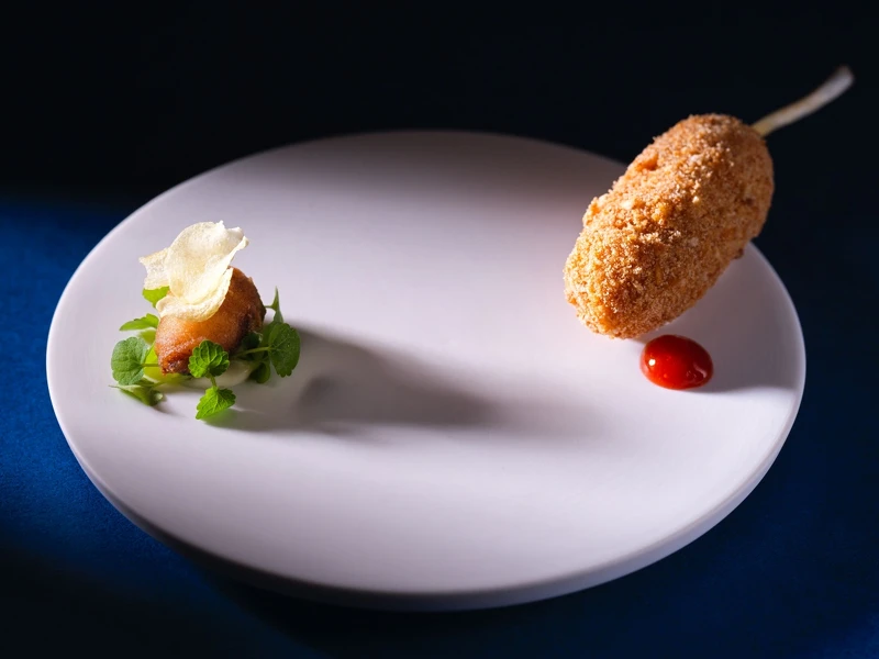 「鹹酥雞」的迷人風味來自九層塔的清香、胡椒粉的微辣,以及蒜頭的濃郁辛香,搭配酥脆外皮與鹹中帶甜的調味,每一口都讓人欲罷不能。Chef Bruce 選用田雞腿為主角重新詮釋這道台灣經典小吃。取用田雞大腿部位,裹上鹹香的醬油仙貝,增添酥脆層次,同時帶出食材的鮮甜與鹹香;小腿則用蒜頭、香油和五香粉醃製,融入台式風情,再撒上帶有微微果香的陳皮椒鹽,風味更加多層次。搭配茴香與自製香料辣椒醬,酸辣中帶有香料的深度,讓人忍不住一再回味,精緻卻又不失趣味。
