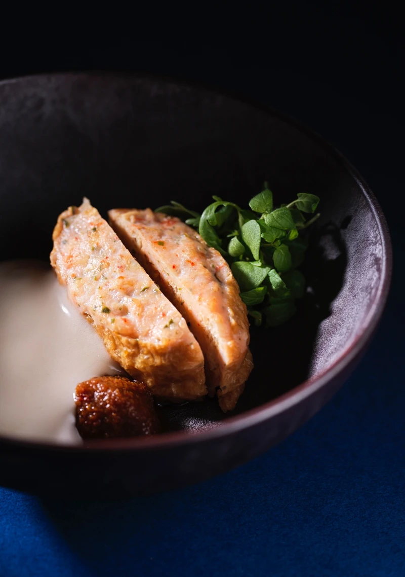 羊鞍為主菜之一,靈感取自台灣秋冬溫暖滋補的「藥膳羊肉爐」。主廚特別挑選了紐西蘭羊肉,使用油封的方式讓肉質保持鮮嫩,外皮烤得酥脆,搭配當歸、黃耆等中藥材調製的醬汁,這些藥材不僅增添了風味,還具有補血養氣、增強免疫力的功效,非常適合在寒冷季節滋補身體。而羊肉爐中常見的貢丸也成為了主廚的靈感,取用羽衣甘藍包裹羊肉餡,再加上枸杞泥點綴,呈現出細緻又滋養的風味。