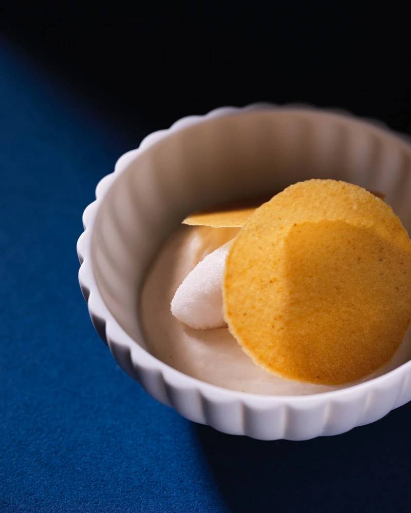 Chef Bruce 將秋天盛產的栗子作為甜點,製作成香脆可口的餅乾,搭配上火烤後散發清香的蕎麥茶冰淇淋,與綿密的栗子慕斯和糖漬西洋梨。四種口味在口中和諧交織,完全展現了秋天的風味。