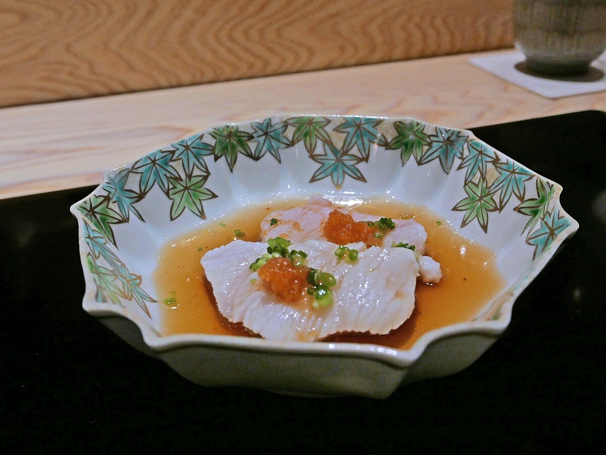 選用來自宮城縣氣仙沼的鰹魚,料理長特別說到日本一年有三次機會可品嚐到鰹魚,由以春天的「初鰹」最有名。對江戶人而言,「初鰹」被視為無論花多少錢都必須品嚐的極品美味。 此次料理長將魚肉切片,浸漬在醬油、味醂調製的醬汁中,最後點綴上紫蘇花,可品嚐到魚肉鮮美油脂的滋味。
