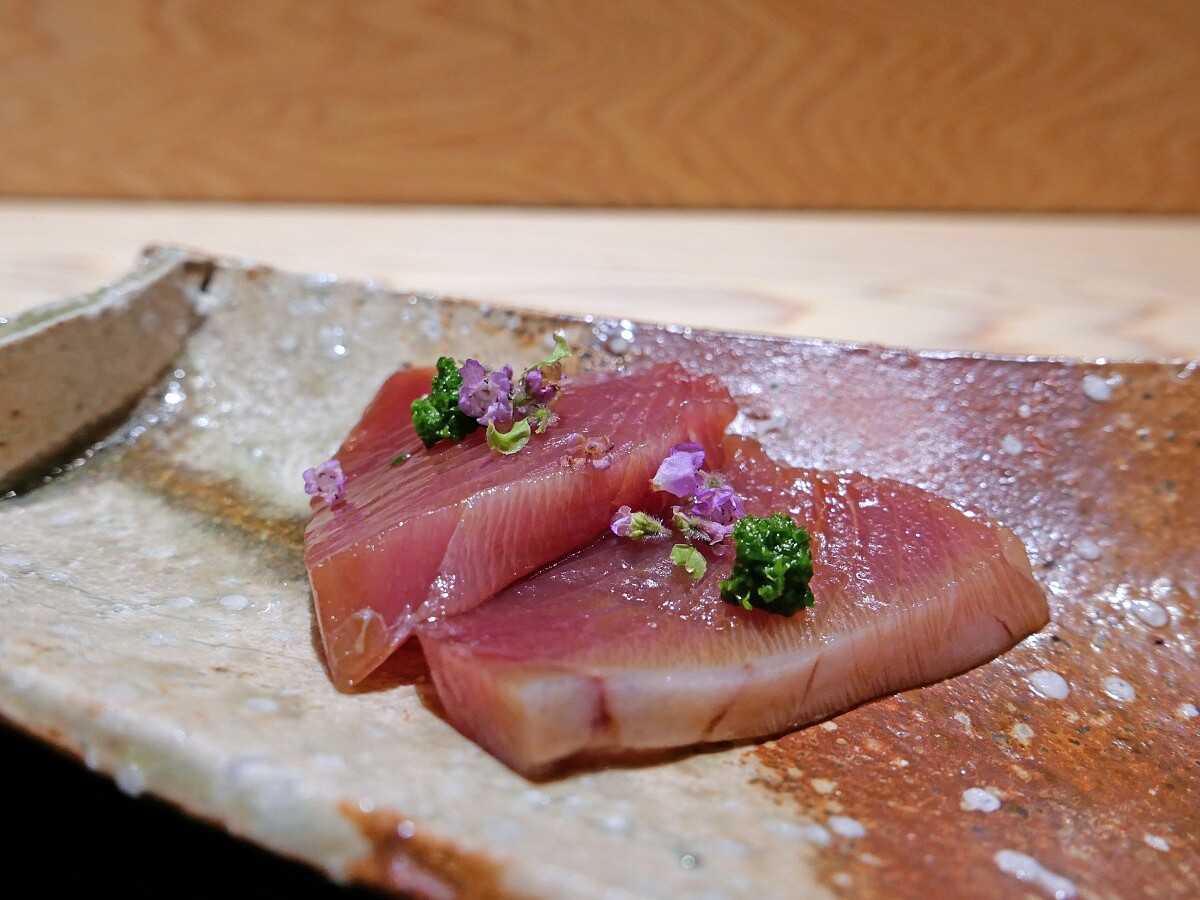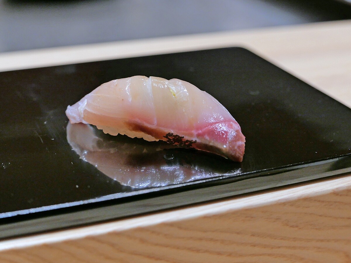 重約2公斤來自高知縣的縞鰺,因為體型大因此需熟成5天左右或以上。料理長在熟成時僅撒上些許鹽,避免去除過多水分。僅以些許醬油調味就能感受到新鮮的海潮香氣與魚肉本身的鮮甜滋味。