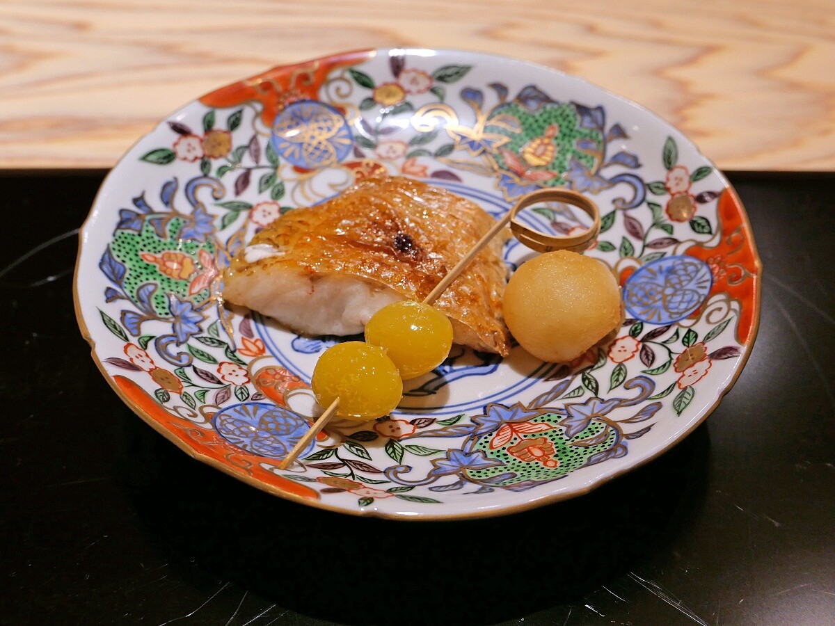以簡單鹽烤方式處理石川來的紅喉魚,可展現魚肉本身鮮甜肥美,一旁有銀杏、蘿蔔泥可搭配使用。冬季正是紅喉最肥美季節,其肉質鮮甜,加熱後脂肪融化,散發出迷人香氣。再品嘗原味後,再以搭配蘿蔔泥一起享用,感受其風味變化。