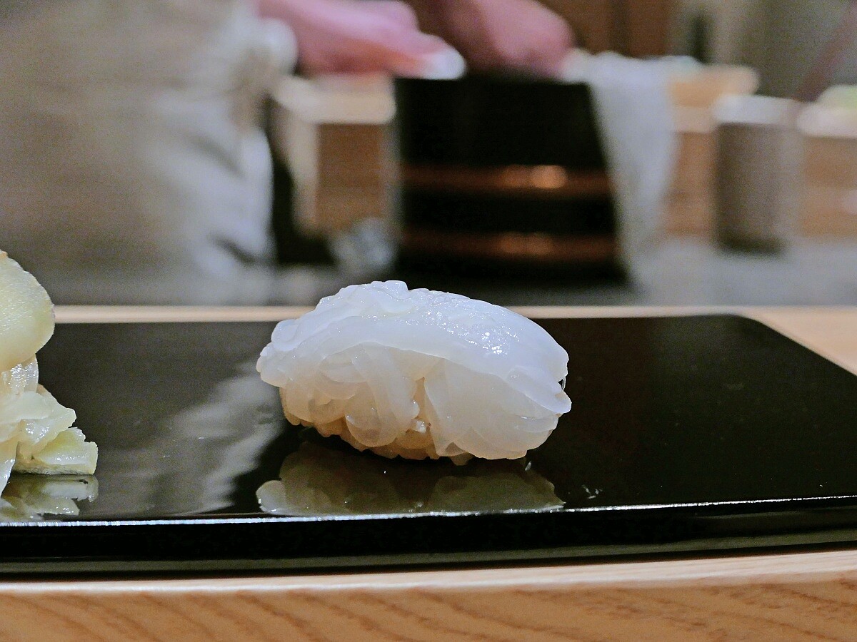來自山口縣的墨烏賊,以分切清洗之後需要先冷凍再使用,且需仔細去除表皮。料理長將墨烏賊切成細絲,以利更容易釋放出其鮮甜的滋味。以鹽和酢橘調味,當鹽粒與烏賊立體的口感交融,同時也帶來迷人的甜味,加上酸、鹹香氣完美融合,令人印象深刻。