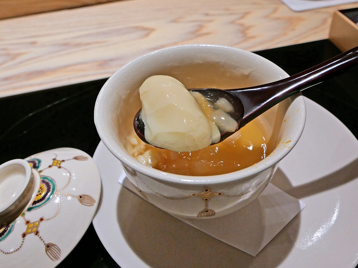 為了呈現柔滑口感,特別增加了高湯用量,使其口感如絲綢般滑順細緻,頂部綴以鯡魚卵增添口感層次。