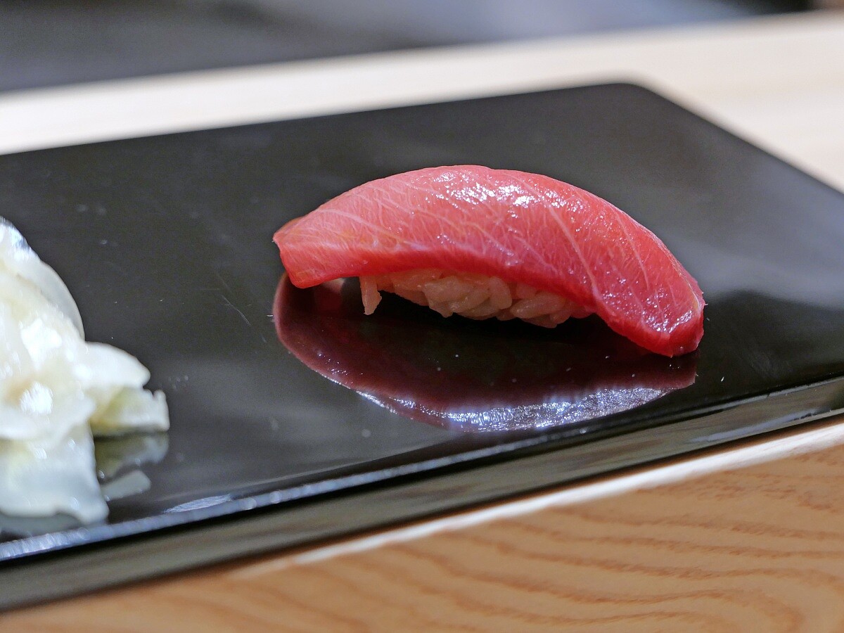 來自北海道噴火灣定置漁場捕撈約有177公斤重的鮪魚,將赤身部位經過約兩週的熟成,僅刷些醬油就能展現最原始的鮮美滋味。料理長特以赤醋飯搭配,可充分魚肉的甜味,口感十分清爽。