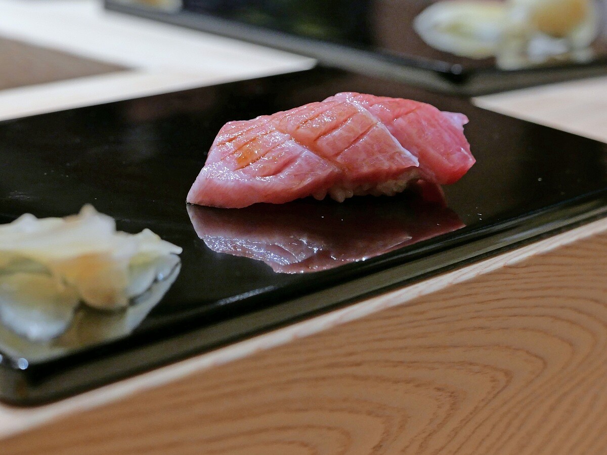 取腹部前端部位,不僅極為軟嫩且富含油脂,料理長為使油脂風味更明顯,特地提前分切,讓魚肉置於室溫下回溫,接著再表面施以切紋,使這塊鮪魚身上最為肥美部位展現如同和牛般入口即化的口感,卻更為爽口。柔軟的肉質與豐富的油脂在咀嚼間迅速融化,散發出濃郁的鮮甜香氣。