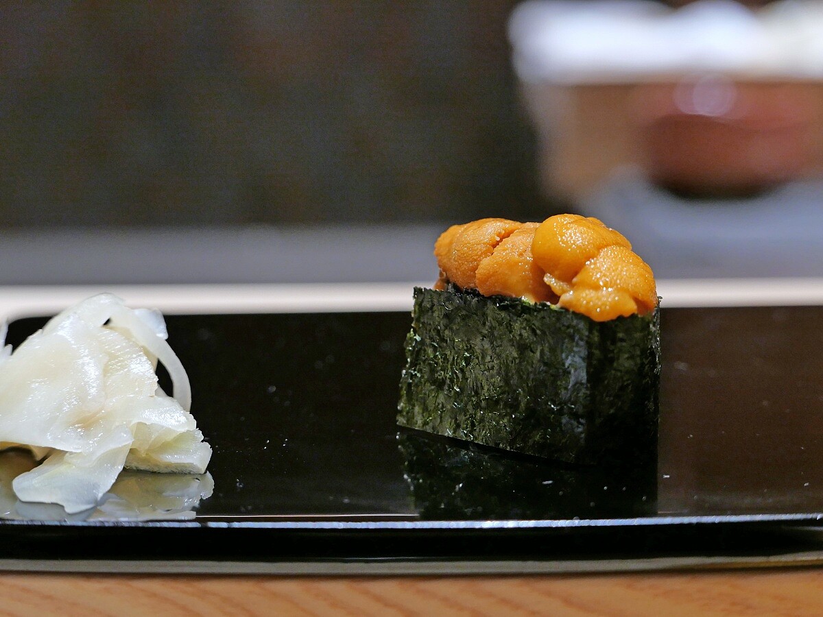 取用來自北海道的馬糞海膽,搭配上來自千葉縣、香氣濃郁且口感脆嫩適中的海苔,兩者濃郁甜美,且帶出海膽鮮甜滋味,悠長的海潮尾韻。