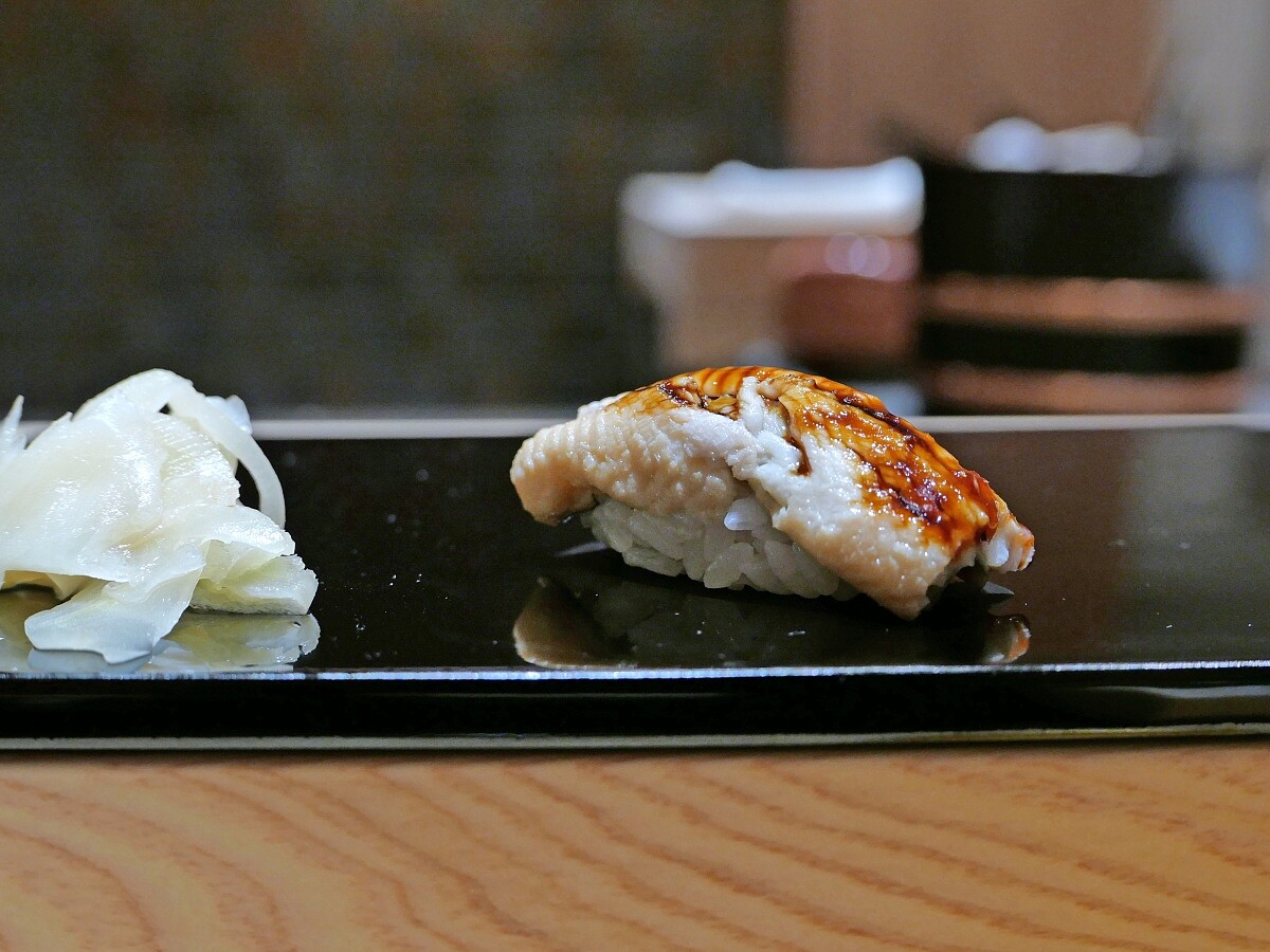 此貫壽司是「鮨 嘉仁」少數以特製醬汁調味的魚料,選用長崎來的穴子,經料理長悉心煮製成柔嫩與綿密中帶有些許纖維的質地,搭配上看似濃郁的醬汁,卻完美搭配穴子入口即化的口感和肥美質地。
