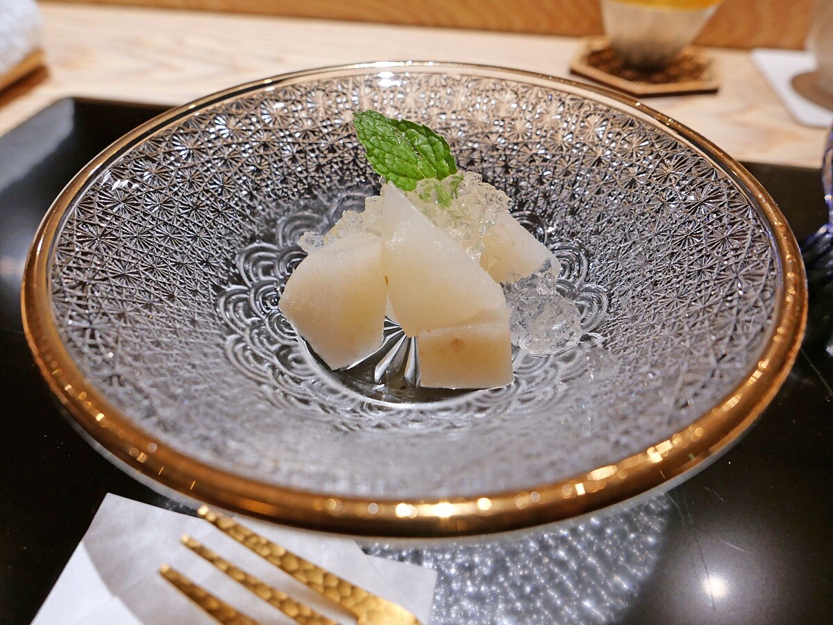 「鮨 嘉仁」首次使用台灣食材入菜,選用當季台灣梨糖煮後佐日本酒果凍,帶來甜郁與清香、滑嫩與軟糯的美好句點。
