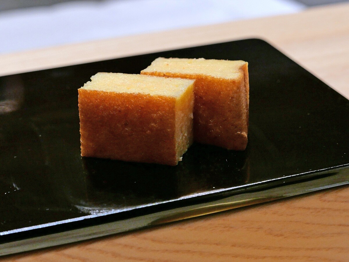玉子燒可視為江戶前壽司的最後一道甜點。玉子燒中加入了蝦漿、大和芋、糖、味醂等,以極小火低溫悉心烘烤1小時而成,烤焙完成後還需熟成1日,製作方式與口感近似蜂蜜蛋糕,獨特甜味和豐富蛋香令人印象深刻。