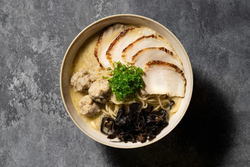 整隻紅羽土雞熬製5小時的濃郁乳白湯,搭配彈牙的春小麥拉麵,入口便是滿滿膠原蛋白的潤澤感,再搭配紹興醉雞、手工雞肉丸與黑木耳,整體滋味溫潤而深厚,是一碗能暖心暖胃的美味之選。