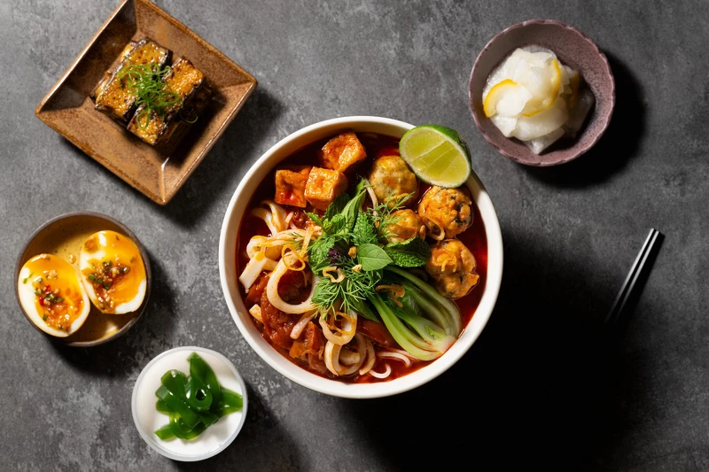 融合法式龍蝦湯工藝,酸香的番茄湯底加入龍蝦頭、胭脂蝦頭及羅望子提味,再配上爽口的越南米線。湯中還有手工花枝丸、蝦丸與中卷,層層堆疊的鮮味讓人一吃就停不下來。