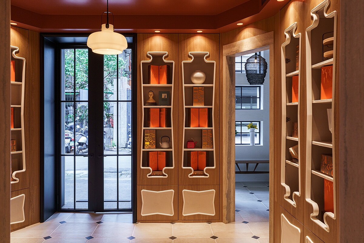 一樓大廳為環360度八角對稱設計,並將新古典主義帶入整體風格。鮮明跳色的禮盒在分別在八角邊上的櫃體中與飾物交錯置放,幾何與撞色元素爲空間注入時尚氣息,典雅和諧中又不失摩登趣味。天然銀河洞石製成的拱門與吧台、古磚切割拼接地板、仿舊灰彩玻璃與絨布材質的大量運用,再現了傳統美學理念崇尚的理性與平衡。