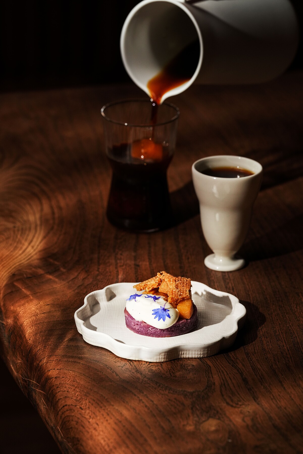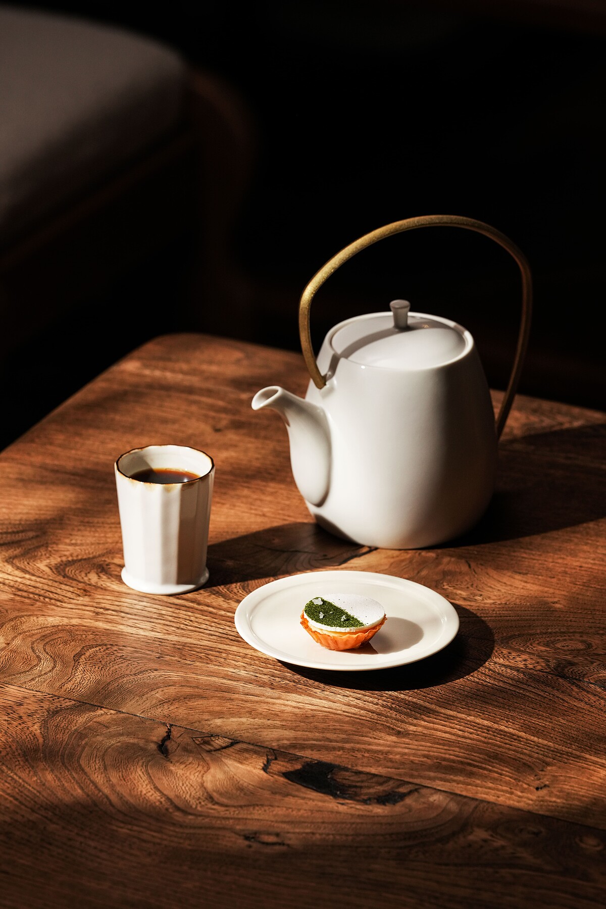 獨創的「壺泡」品飲方式跳脫了過去的沖泡皆是單杯製成的形式,在茶文化中提取分享的元素。嚴選享譽全球的巴拿馬 Ninety Plus 莊園 Yuzo 藝伎咖啡,前段如清酒般帶有柚子香氣、中段麝香葡萄的調性及後段金合歡蜂蜜的尾韻,搭配 Angela 創作的帕瑪森 Cheese 檸檬塔,引出獨特的鹹甜風味,而海苔蛋白糖霜疊加出不同層次感,舌尖充溢宜人的海洋氣息。