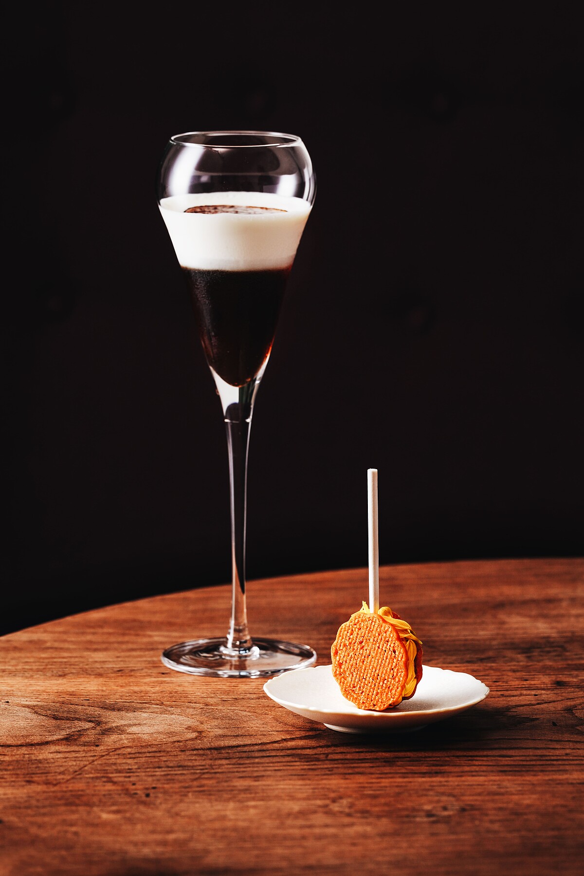 甜點部分,夾心餅乾棒棒糖的外型十分討喜,帶點童趣,鹽麴鳳梨果醬的甜鹹鮮味為整體基調注入熱帶風情,中間夾層的鹹蛋黃奶油(Buttercream) 充滿濃郁鹹香,而酥脆鹹蛋黃餅乾則提升了品嚐的趣味,點綴的肉鬆與微苦的杭菊花瓣則與咖啡的煙燻韻味相輔相成。此款特調咖啡與甜點交錯品嚐,當兩者風味在口中疊加產生的美好滋味令人傾心,回味再三。