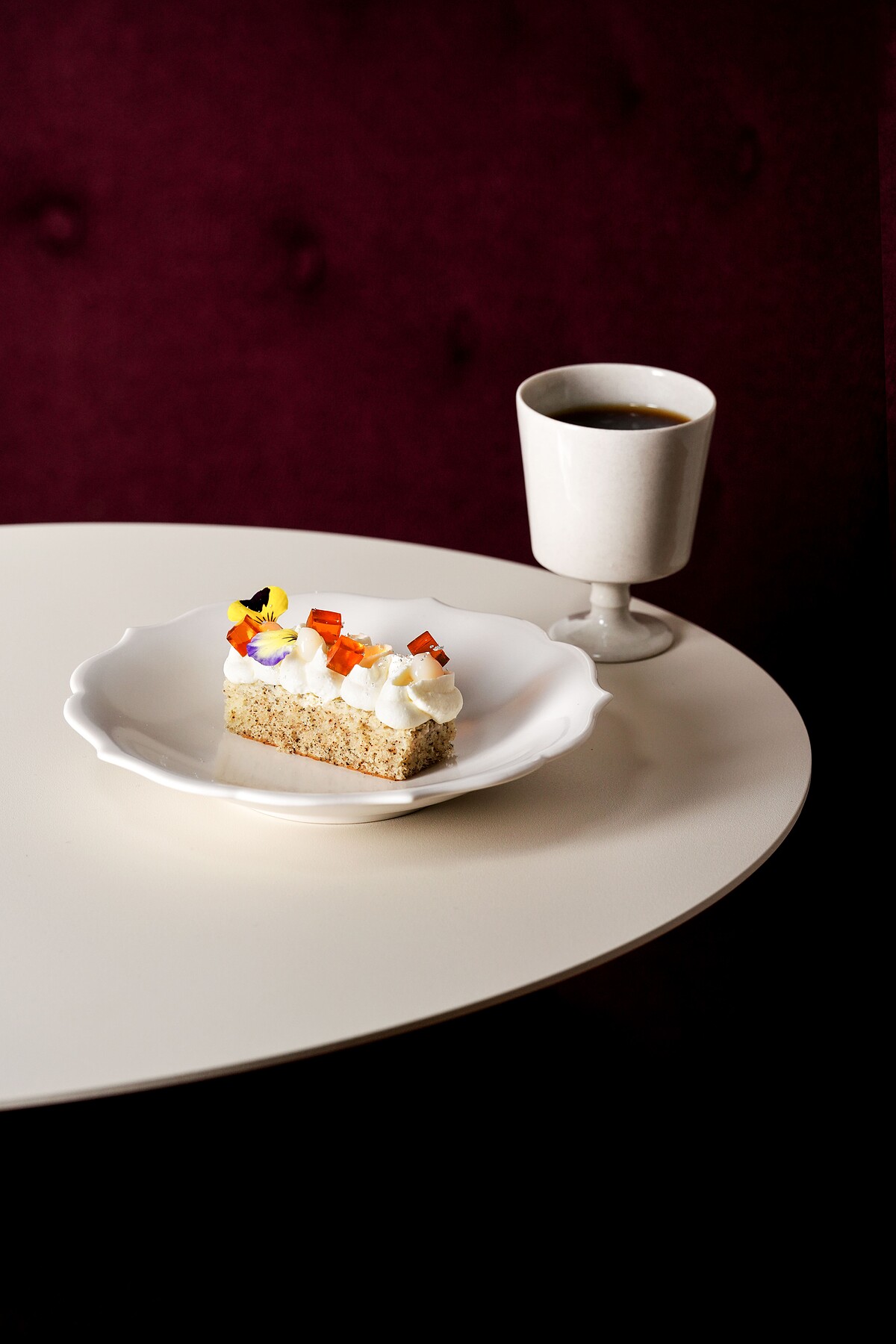 Angela 使用鐵觀音戚風蛋糕為主調,搭配特製荔枝醬,營造清爽果香同時也深化咖啡蘊藏的荔枝香氣,而焦糖果凍帶來滑順的甜香,呼應咖啡焦糖韻味。最後,覆蓋的馬斯卡彭香緹奶油,交融整體味道之邊界,是一次使人神往不已的創作組合。