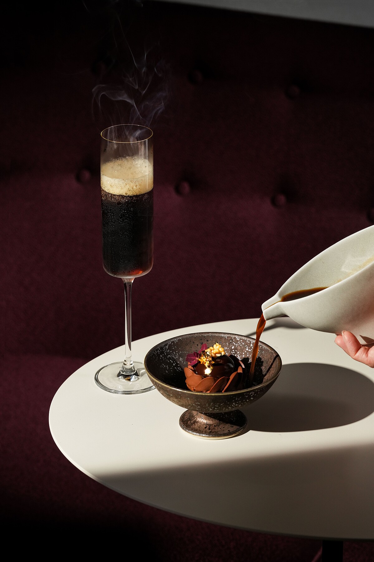Angela 精選70% Madong 巧克力,以煙燻似桂圓的香氣為核心風味,搭配紫米酒釀和杏仁巧克力蛋糕,帶來醇厚口感。紅棗薑湯增添溫暖底韻,微量的黑麻油點注,溫潤且充滿力量的尾韻,呈現出中式藥膳與西式甜點完美融匯。
