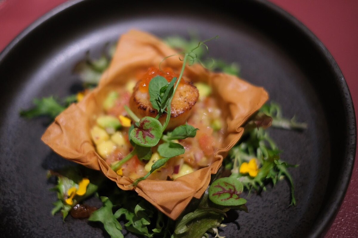 說到情人節大餐怎麼能少了海鮮?這道北海道干貝可不只是干貝而已,還有酪梨莎莎、鮭魚卵、飛洛塔酥皮,層層堆疊出驚喜口感。干貝外層微微炙燒,保留內部的鮮嫩多汁,搭配濃郁的酪梨莎莎,鮮甜中帶點奶香,再來一口爆漿的鮭魚卵,鹹香瞬間在嘴裡炸開。底下的酥皮則像愛情的基石,脆得剛剛好。