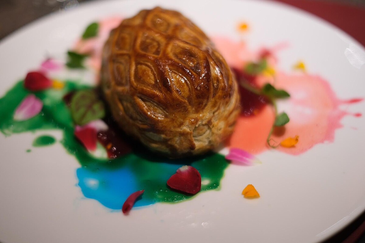 想吃得更清爽一點?那就選這道鮭魚威靈頓!酥脆的外皮包裹著鮮嫩的鮭魚,內餡還夾著菠菜和酸豆檸檬奶油起司,每一口都是層層驚喜。特別的是這道菜搭配的是覆盆子楓糖紅酒醬,酸甜的滋味讓人忍不住一口接一口,根本停不下來。而且盤子上還有藝術家Amy的流動畫元素,吃之前先拍個照,保證美到讓IG爆紅!