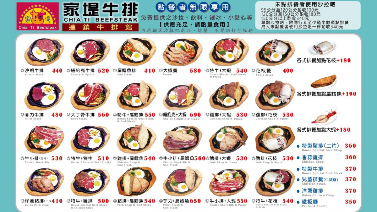 三重隱藏版美味「家堤牛排」,是在地經營十餘年的老餐廳,被稱為三重人「12廚」,完全不怕你吃,生意很好但不開放訂位,建議大家在用餐時間可以早點現場候位。家堤的排餐360元起,如果想專攻自助吧,只要340元就能無限享用滷味麻辣燙、生菜沙拉、熱炒、炸物點心、水果、濃湯、麵包等超多種熱騰騰副餐,荷苞不痛吃得超過癮。
