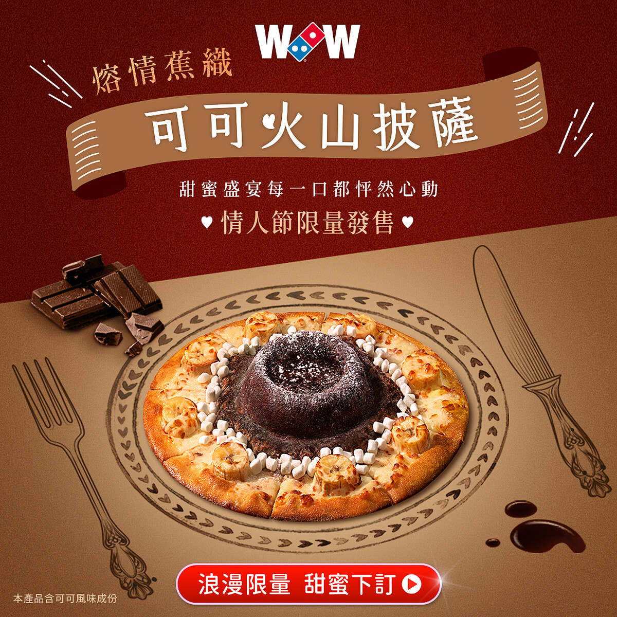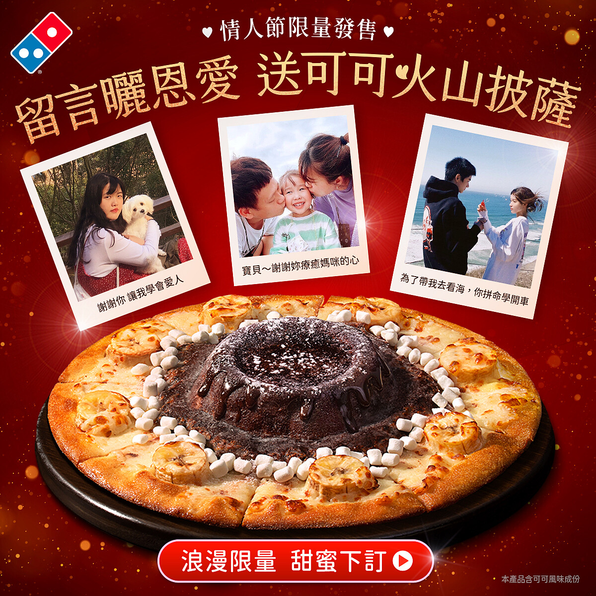 今年情人節達美樂再度突破披薩的傳統印象,推出全球獨家的「可可火山披薩」,讓甜蜜氛圍瞬間升級。這款披薩擁有獨特的3D火山造型,內藏濃郁爆漿的可可熔岩醬,再搭配台灣在地香蕉的自然甜味,每一口都是戀愛般的幸福滋味。這款情人節限定披薩不僅適合戀人共度浪漫時光,更是朋友聚會、單身派對的完美選擇。無論是與心愛的人共享甜蜜時刻,還是和好友一起開趴,都能感受到這場前所未有的美味體驗。