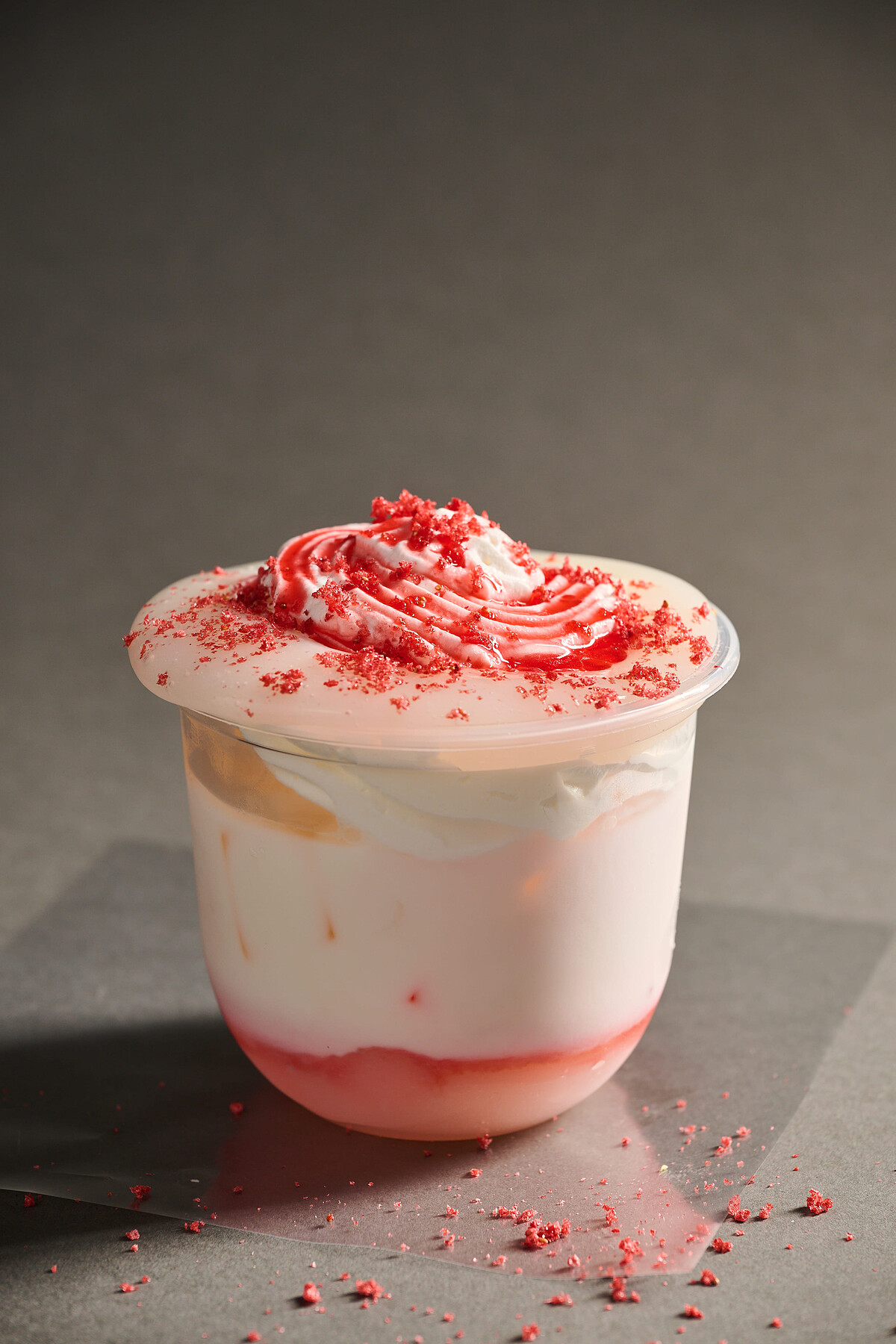 草莓牛奶大福飲(130元):濃厚鮮乳搭配大福內餡,草莓香氣滿溢,甜而不膩
