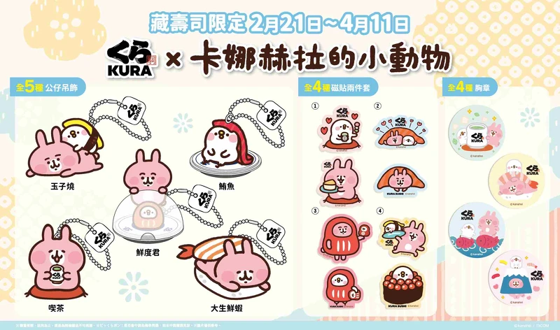春天來了,藏壽司準備用最療癒的方式迎接新季節!今年特別攜手超人氣角色 「卡娜赫拉的小動物」,推出限時限定 13款春日造型扭蛋,讓P助和粉紅兔兔化身可愛小公仔、胸章和磁貼兩件組,陪你一起開心迎接春天。這波萌力爆擊將從2月21日開跑,限時登場至4月11日,粉絲們千萬別錯過。