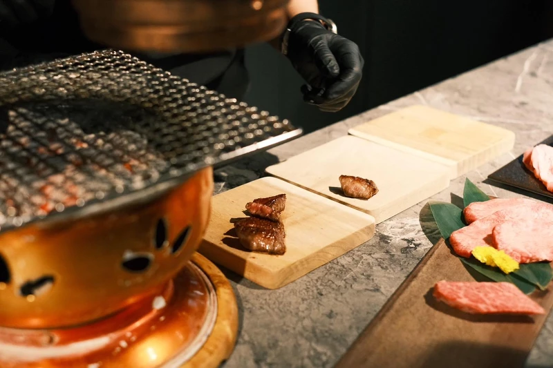 青杉燒肉對於燒烤技術可不是開玩笑的,每一片牛舌都是精準熟成、現點現烤,使用備長炭的高溫燒烤技巧,讓牛舌表面微微焦香,同時鎖住內部肉汁,吃起來外酥內嫩,風味層層堆疊,簡直是舌尖上的藝術。當然光是烤得好還不夠,吃法也很講究!這次青杉特別準備了六種專屬佐料,讓饕客們可以自己DIY最完美的牛舌搭配。