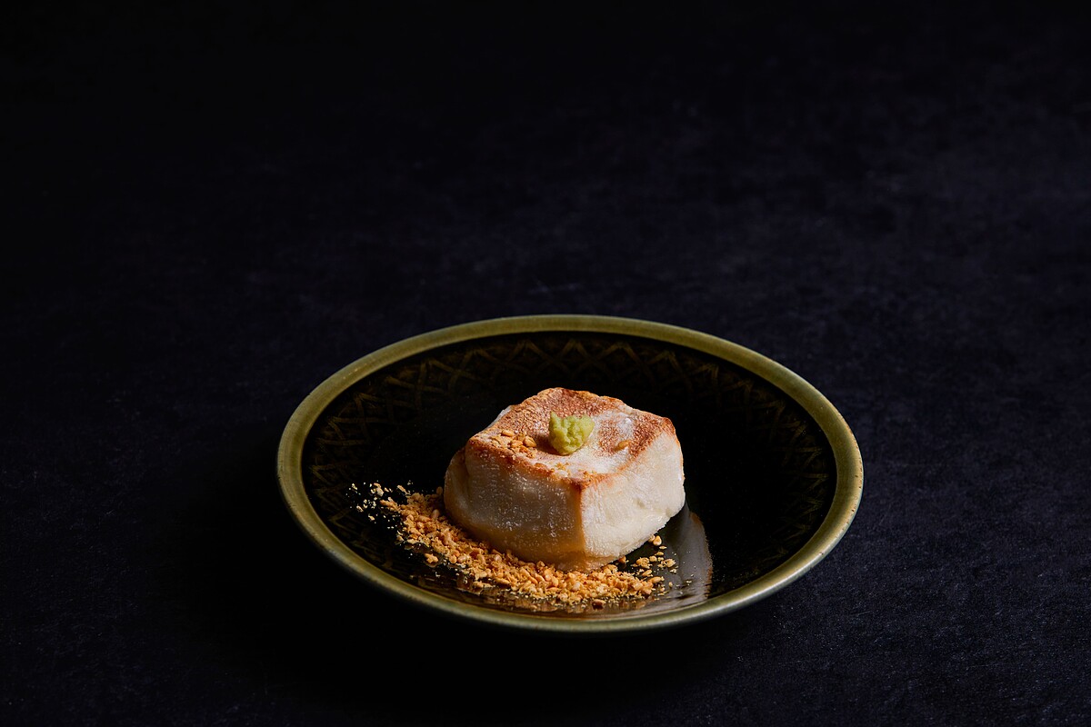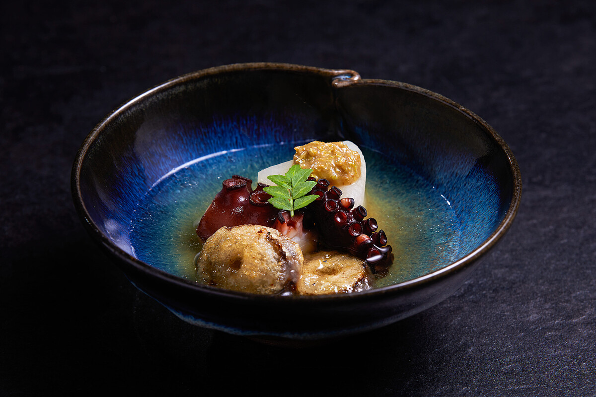 其中經典開胃菜「胡麻豆腐」依舊是必嚐之作,需歷時四天精雕細琢,口感細膩如河豚白子般滑順,入口即化,勾勒出柔和的春日序曲。另一道細緻之作「章魚柔煮」則以四小時低溫燉煮,讓章魚肉質綿密柔嫩,呈現春季料理的極致溫潤。