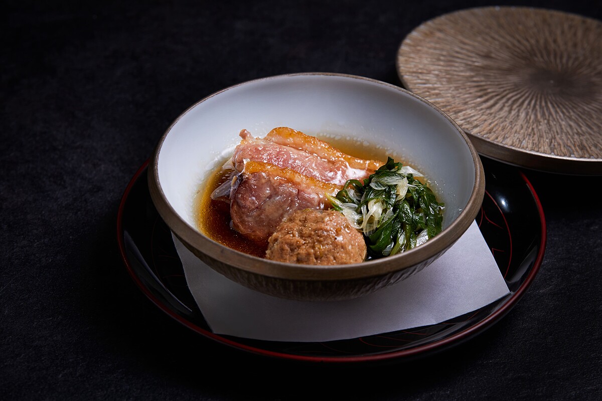 作為這次春季菜單的亮點之一,「鴨治部煮」靈感來自日本金澤的傳統「治部煮」,但在「琥珀割烹」被重新演繹出更具層次的風貌。料理長小田健治選用熟成十天的宜蘭胭脂鴨,以薄片裹粉後低溫燉煮,使肉質保持細嫩且吸收醇厚的高湯風味。搭配手工丸子與當季蔬菜,湯汁鮮甜回甘,最後撒上宜蘭三星蔥點綴,賦予鴨肉更豐富的香氣層次,呈現台日交融的細膩味覺體驗。