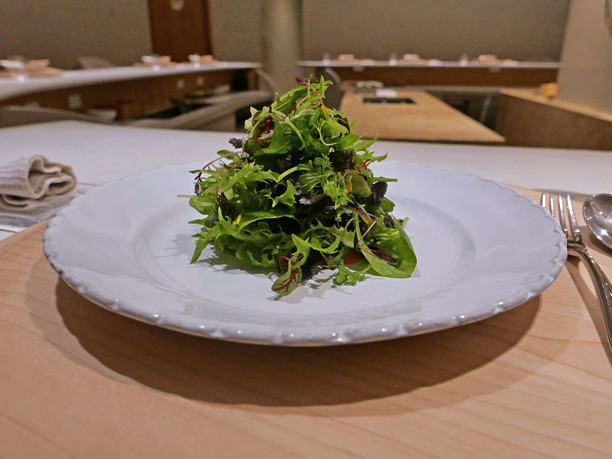 選用高雄大社水耕農栽種的苗菜,每天都選用不同的種類搭配,並僅用海藻鹽、橄欖油調味,能先品嚐原味。之後稍微攪拌,拌入碗底的醬汁,是以聖女番茄作為基底,並加入法棍麵包增添黏稠感,洋蔥則帶來甜味。單純的香氣中可品嚐到酸、甜、鮮、甜,以及菜葉帶來的辛辣。