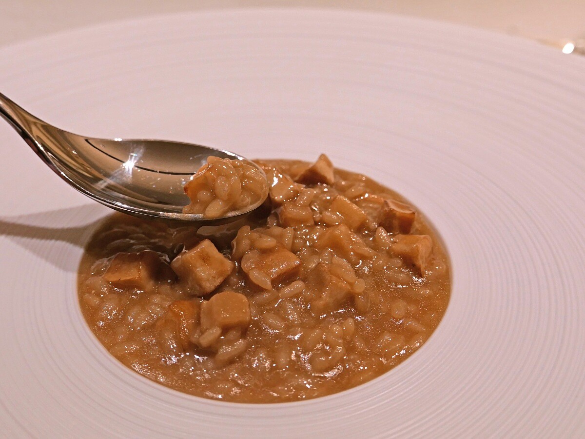 主廚將此燉飯料理命名為「單吞燉飯」,同樣也以單一元素呈現,這同時也實踐了来栖けい 先生的理念,除此外他也希望展現「善用食材」的精髓,同時還能將食材多種風味展現在一道料理中。 而此次這道燉飯使用的是菇類高湯,主廚先將菇煎過、打成汁並熬煮成高湯。在米飯上選用從日本特別訂製的米種,並使用米油取代橄欖油,保持燉飯的乾淨風味。水源選用「Suntory 天然水」,這款水因礦物質含量與輕盈度,使煮出的料理風味更純淨鮮明。如此搭配可將米的甜味和香氣煮出來,而不會受到其他食材的影響。最後放上了煎香的菇丁,讓整道菜更有口感,同時也完美展現食材的魅力。