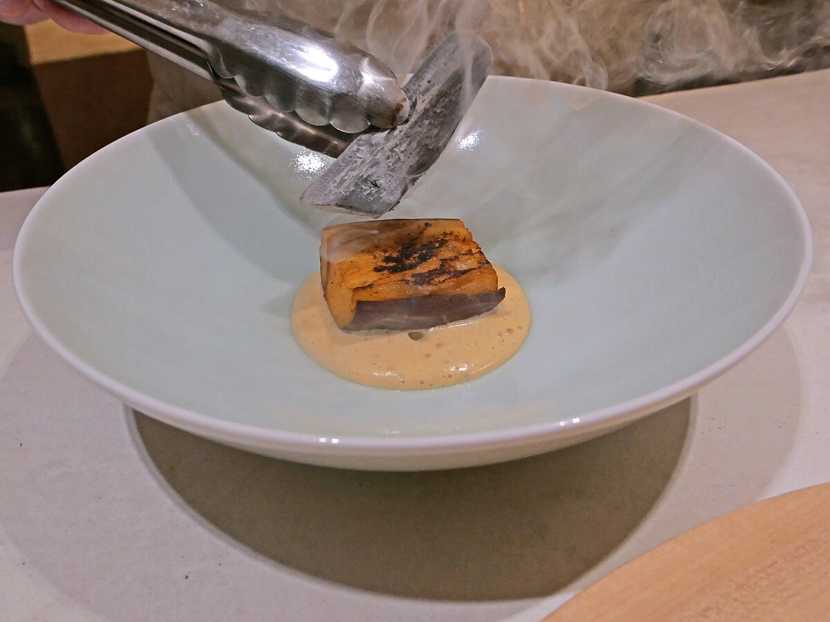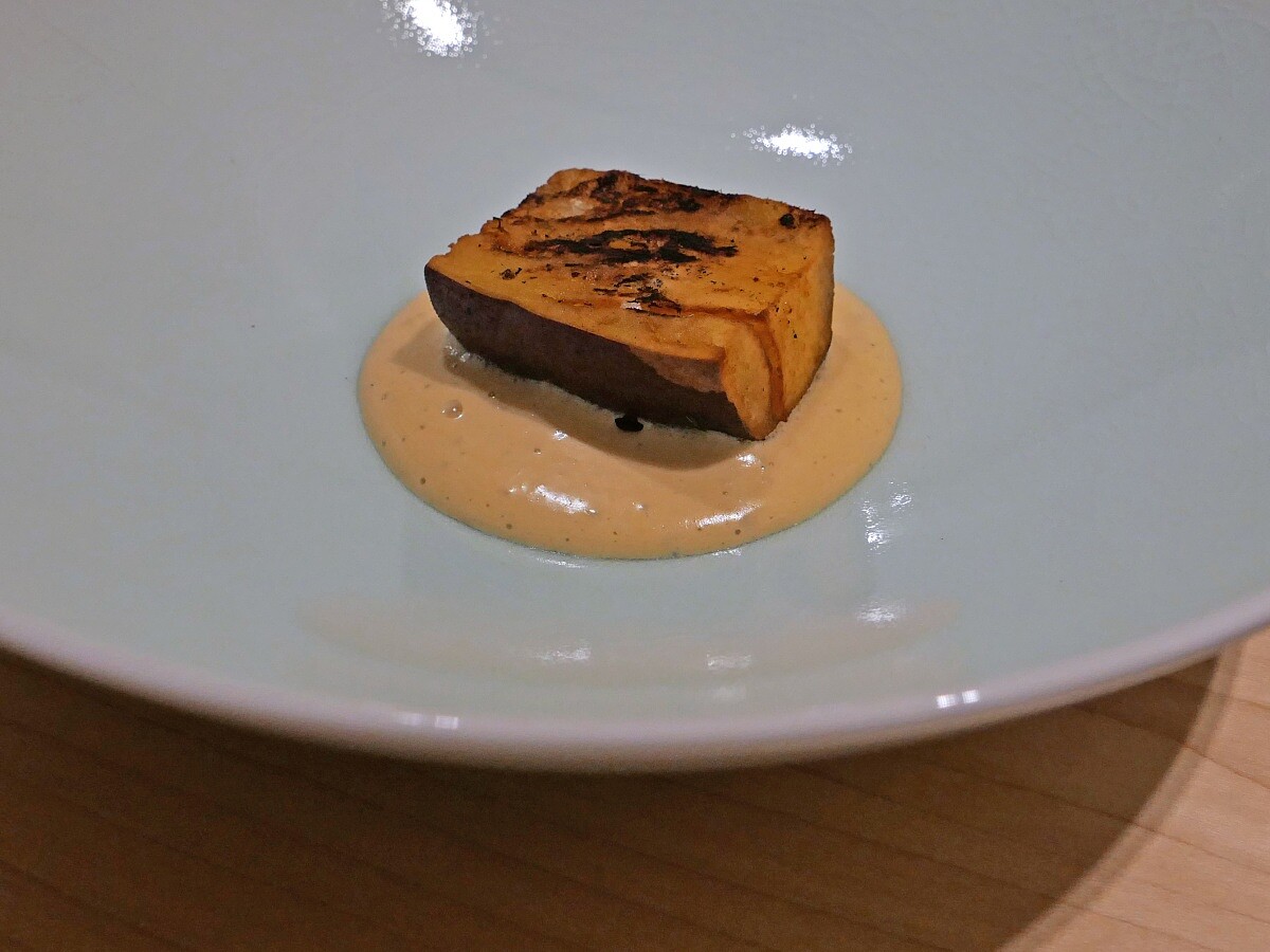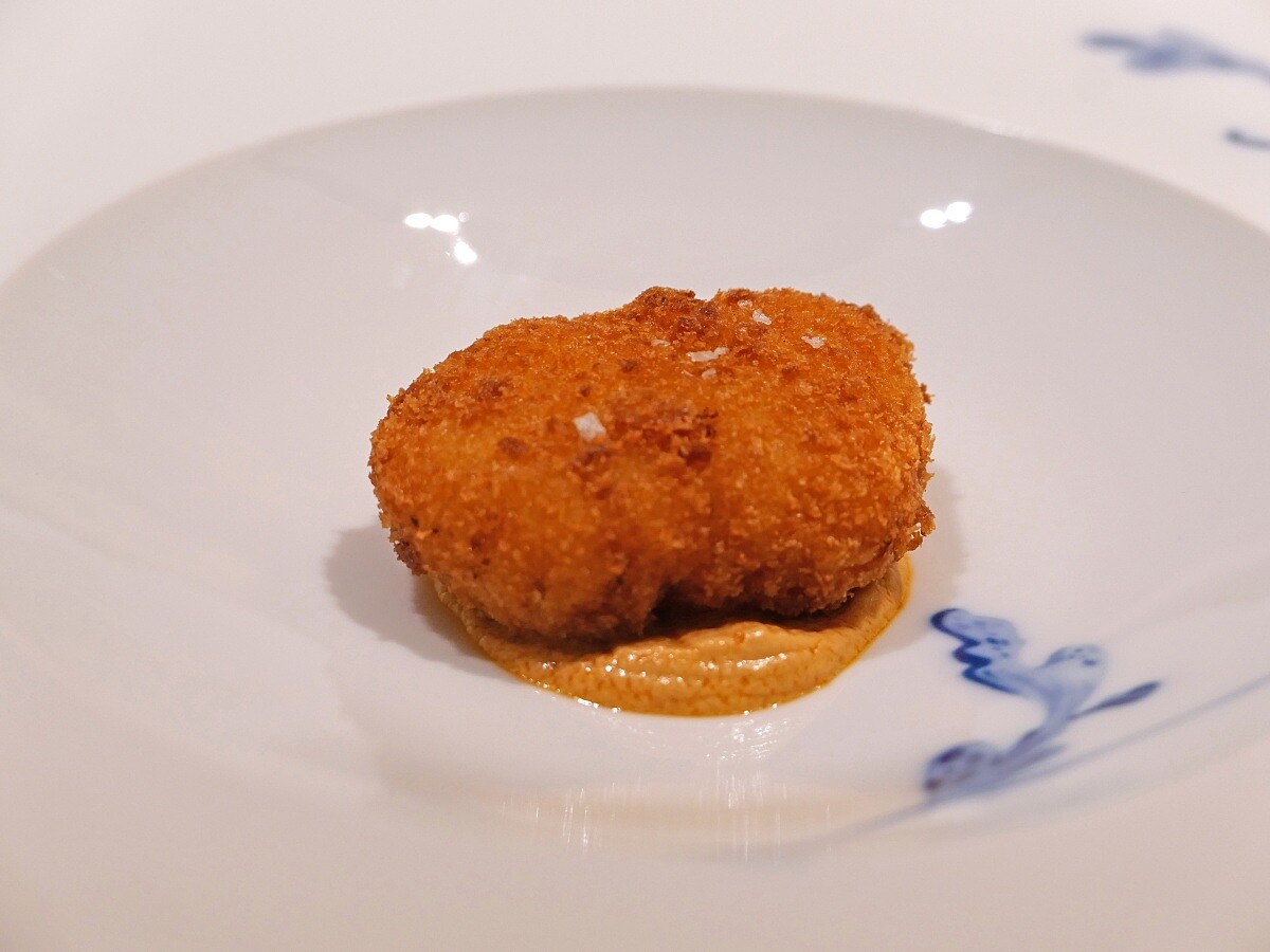 此次選用鮟鱇魚,主廚將魚肉切成約兩到三公分的厚度,並用堆疊的方式,裹上米漿、麵包粉炸製,展現魚肉原本的Q彈口感,底部則鋪有以魚肝製作的醬汁。濃郁的鮮味與絲滑的口感,與炸魚的酥脆形成鮮明對比。
