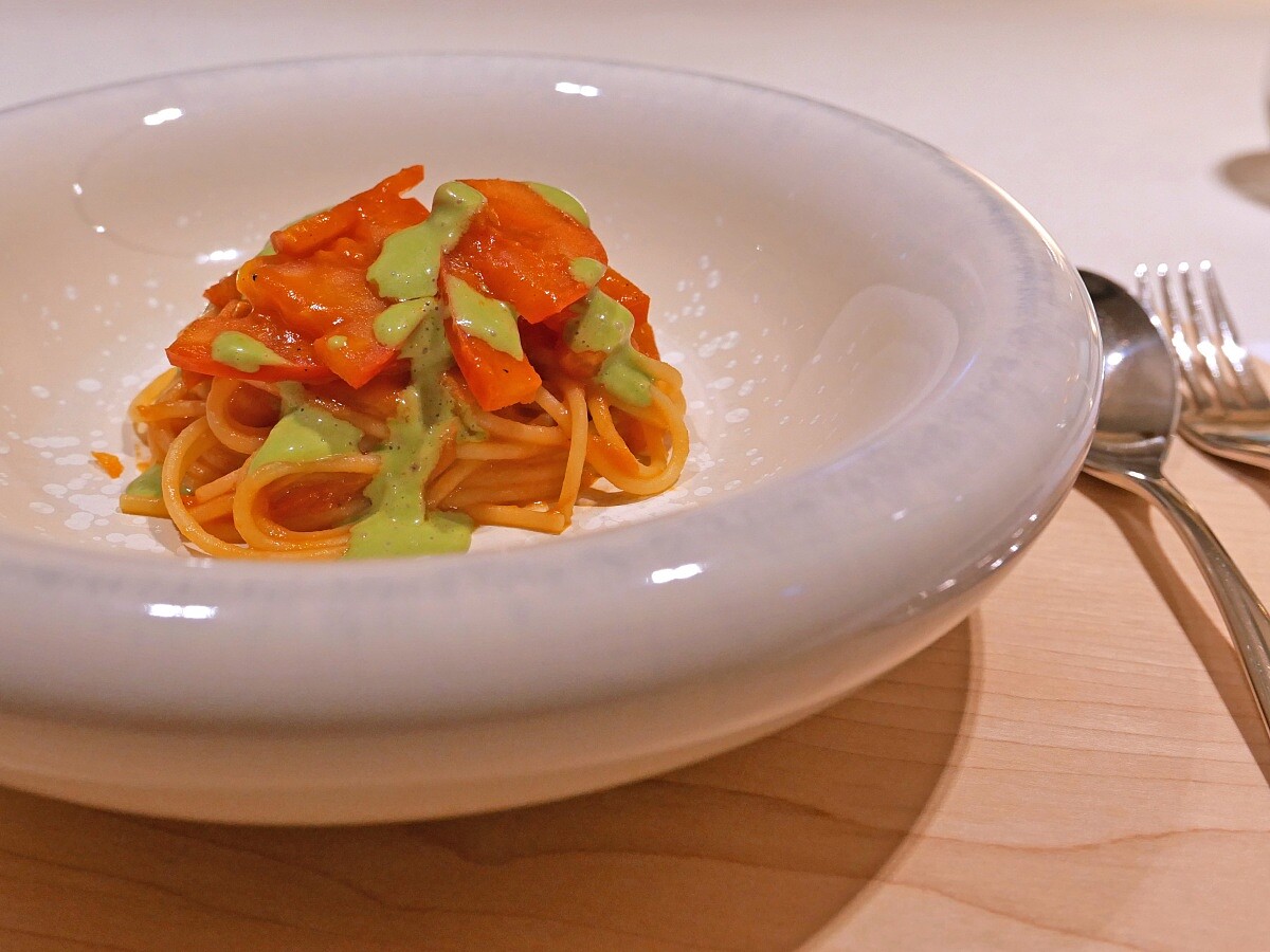 將半顆番茄做成醬汁,其餘則切片入鍋拌炒,而番茄葉、梗則製作成味道超級亮眼的綠色醬汁。再透過義大利麵作為介質,淋上些許的蒜油,就能完整品嘗到番茄的自然、純粹的風味。