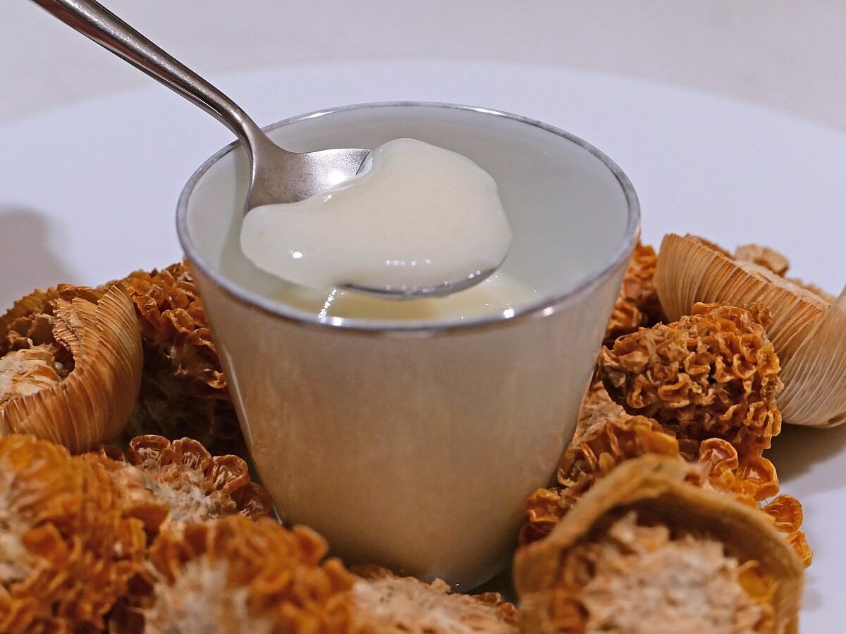這道料理的食材是來自南投的雙珍玉米,高湯是以玉米芯和外層葉子熬煮,再加入少量的蛋白進行凝固,製作成蒸蛋。