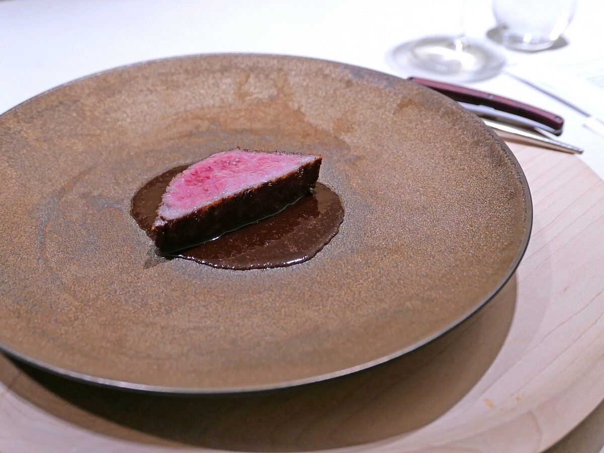 將外層烘煮至焦脆,裡面則保持著軟嫩的口感與豐富的肉汁。同樣以短時間烹調醬汁,是取用淋浸過的肉與骨頭熬製的牛骨高湯,再加入來自法國伯根地村莊的紅酒「Dom. René Leclerc, Gevrey-Chambertin」,這款紅酒的酸度較高且風味紮實,最後完成輕柔確保有香氣的調味。