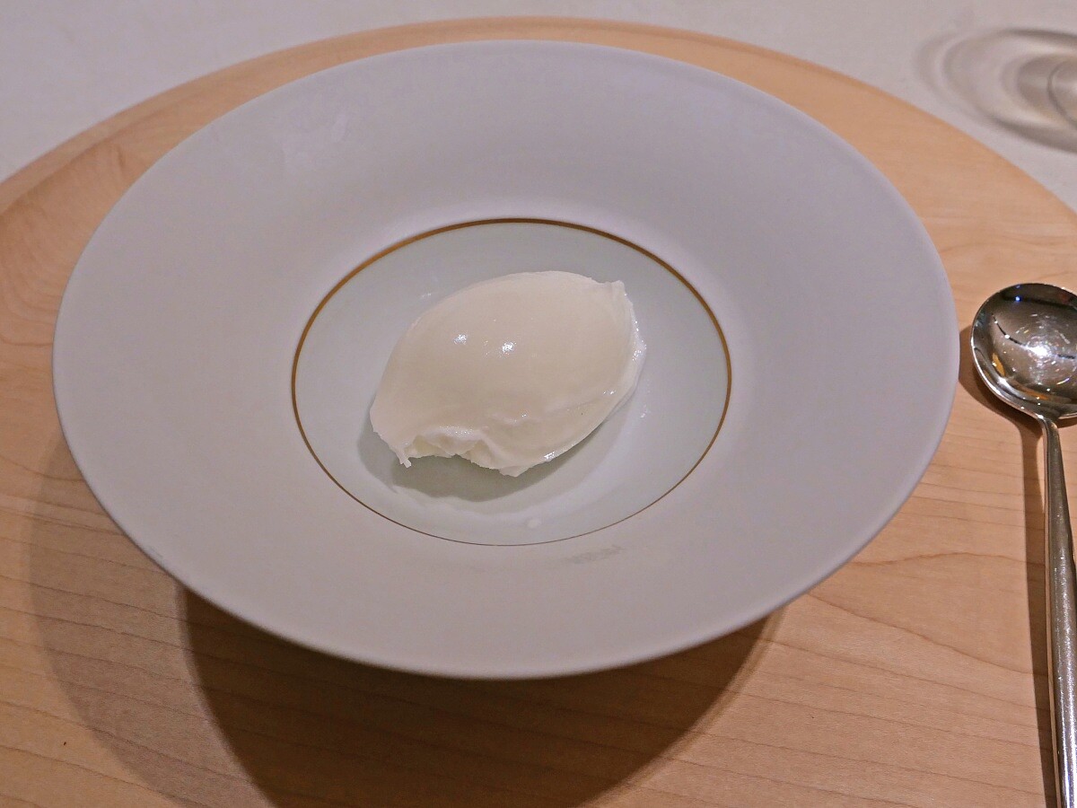 前甜點以台灣高雄的高大鮮乳為主題,並製作成冰淇淋。因為食材僅有牛奶和些許糖,完全無添加任何穩定劑,因此融化速度會非常快。這道甜點同樣承襲自本店「Bon.nu」,每一口都能感受到牛奶香甜純淨的風味。