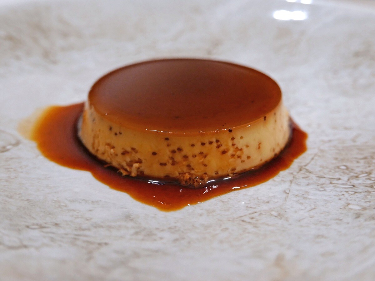 主甜點為日式布丁,同樣使用高雄養蜂場的蜂蛹蛋,因為是以蜂蛹為飼料圈養因而得名。次款雞蛋的蛋白含量也比一般高,為求保持自然的風味,製作過程無添加鮮奶油,只用了整顆雞蛋,牛奶則選用放牧產的牛奶,使得整體搭配更為和諧。搭配上特製的焦糖醬,完美襯托了雞蛋的香氣。