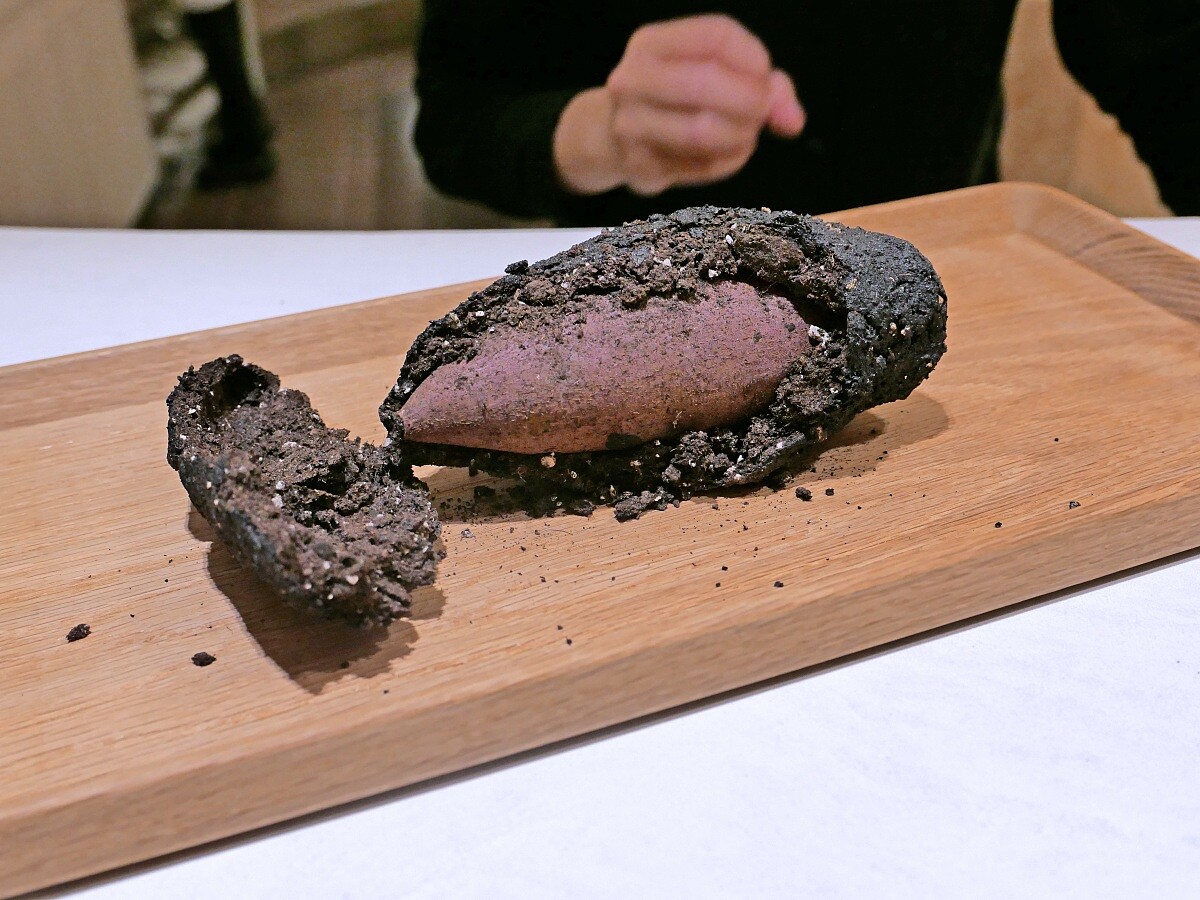 使用與小農合作的春香地瓜,並在收成時會連同土壤一起挖取,能完整保留下食材的風味。除此外,也能讓主廚以原生環境加熱的方式成為料理手法,類似台灣土窯、歐式鹽烤。接著再油炸,增加色澤、口感,香氣也能濃縮其中。