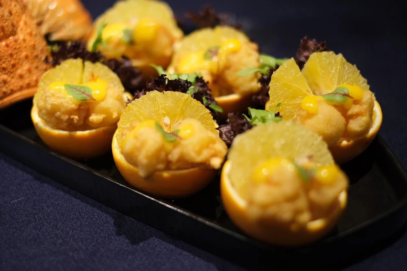 外酥內嫩的鮮炸龍蝦球,搭配柳橙片,微酸微甜的口感讓整道料理充滿清新感,適合想來點開胃口味的饕客。